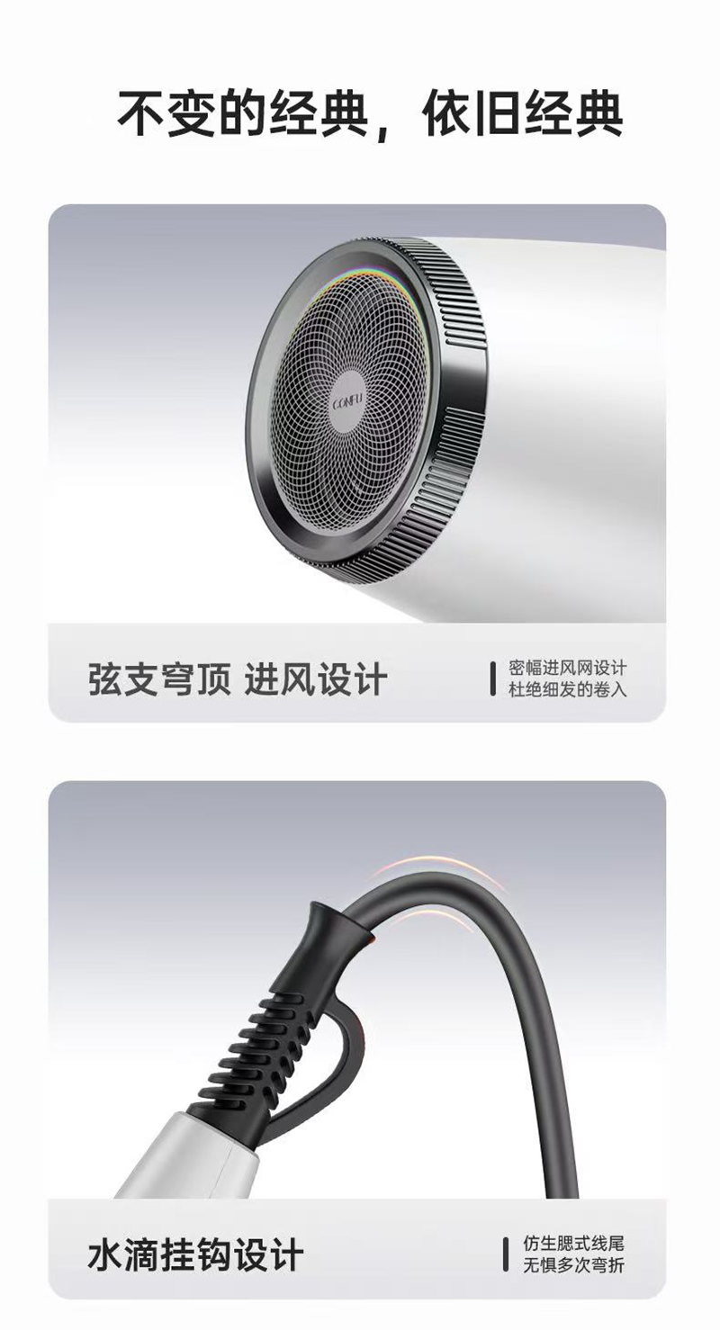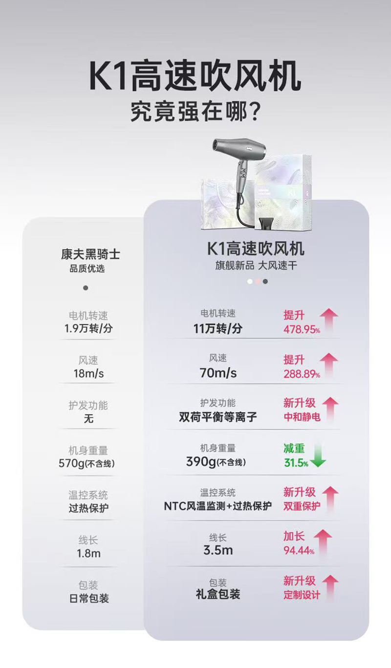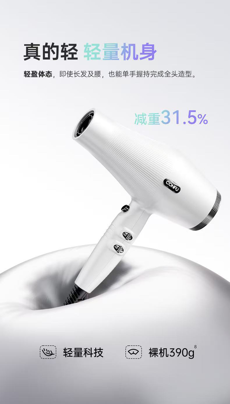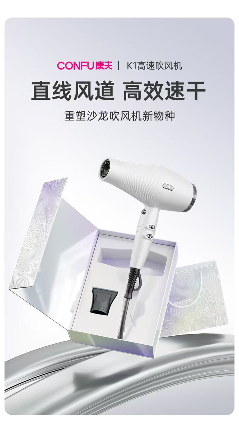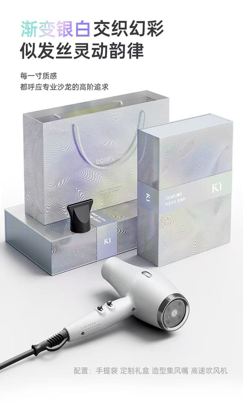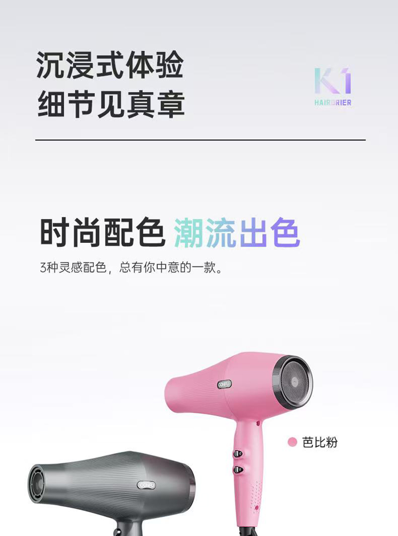 上新/康夫K1轻量化等离子智能控温电吹风2000W3.5米加长线390g灰·白·粉3色可选