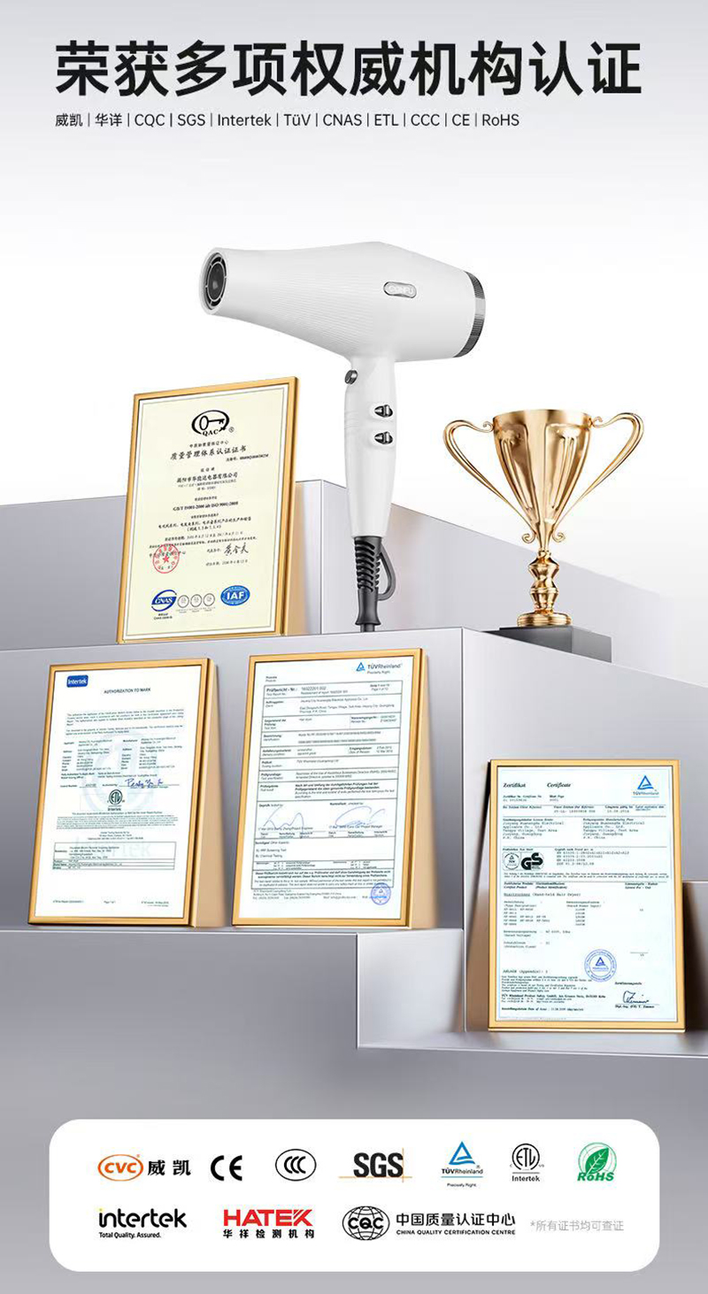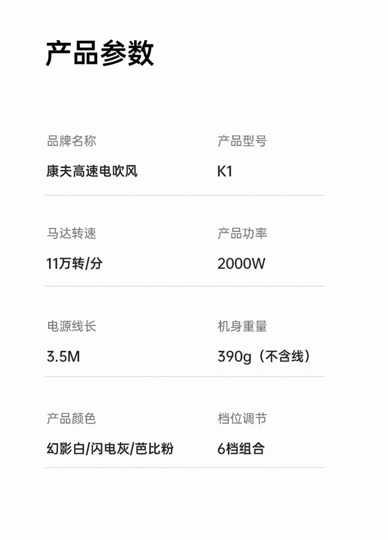 商品名称:上新/康夫K1轻量化等离子智能控温电吹风2000W3.5米加长线390g灰·白·粉3色可选